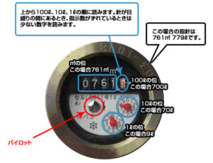 宅内の水道の蛇口を全部閉めた後、メータボックスのふたを開けて、パイロットの針を見てください。針が回っていないときは、異常ありません。
